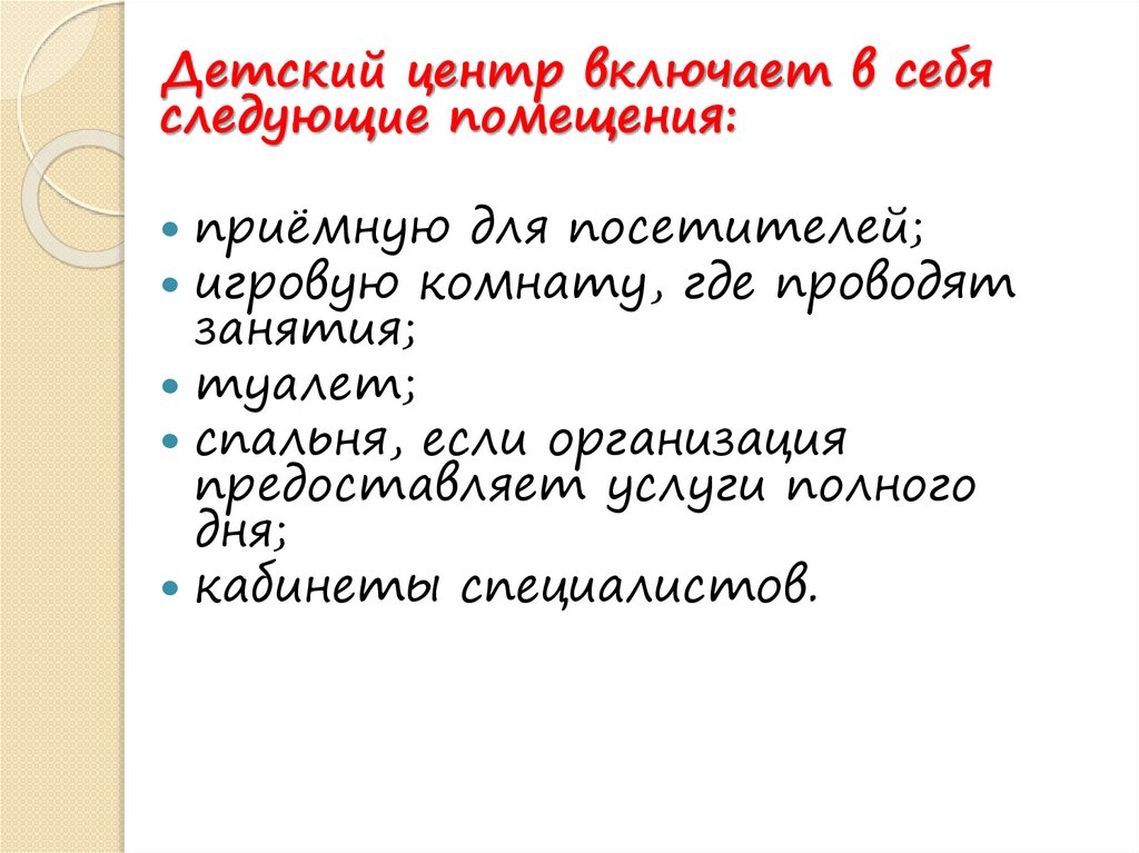 Детский центр включает в себяследующие помещения: