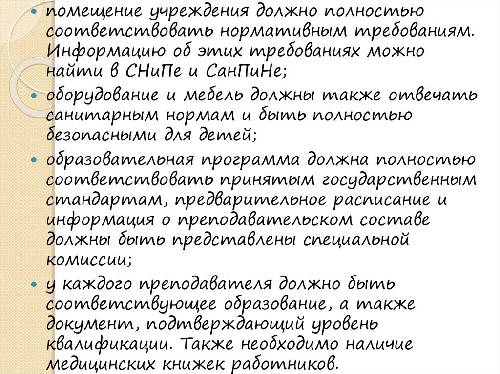 помещение учреждения должно полностьюсоответствовать нормативным требованиям.
