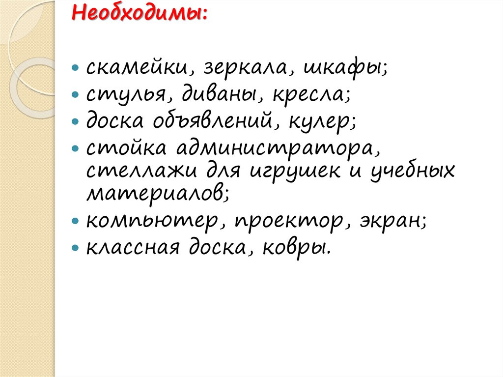 оборудование и мебель должны также отвечать