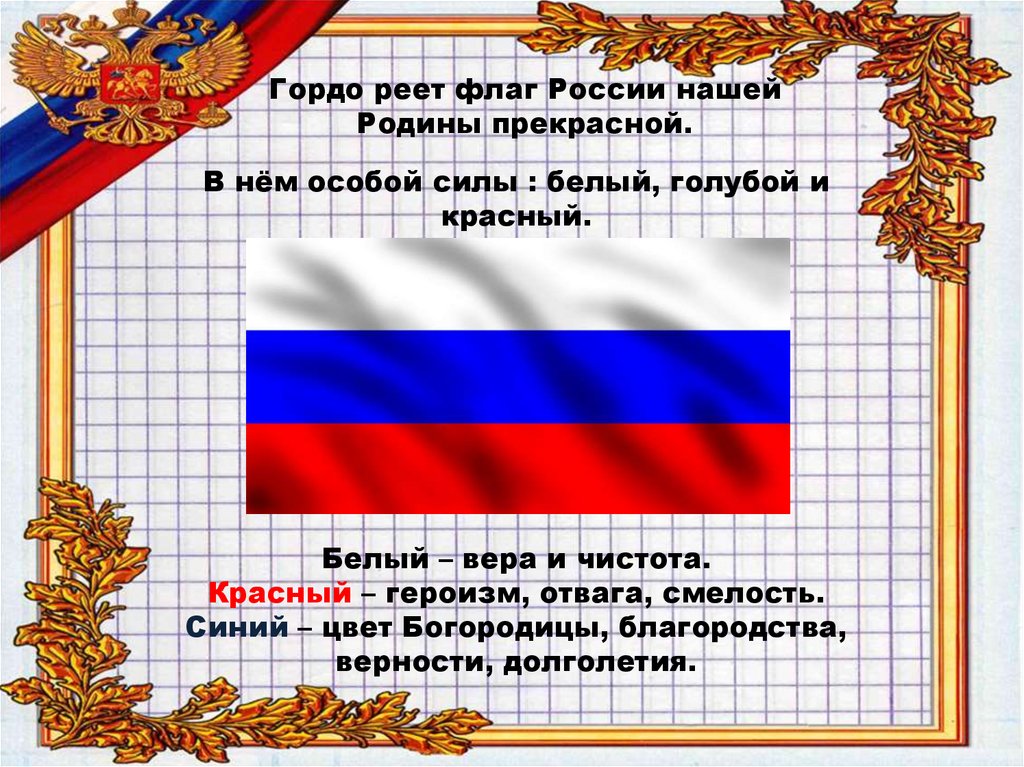 Гордо реет флаг России нашейРодины прекрасной.