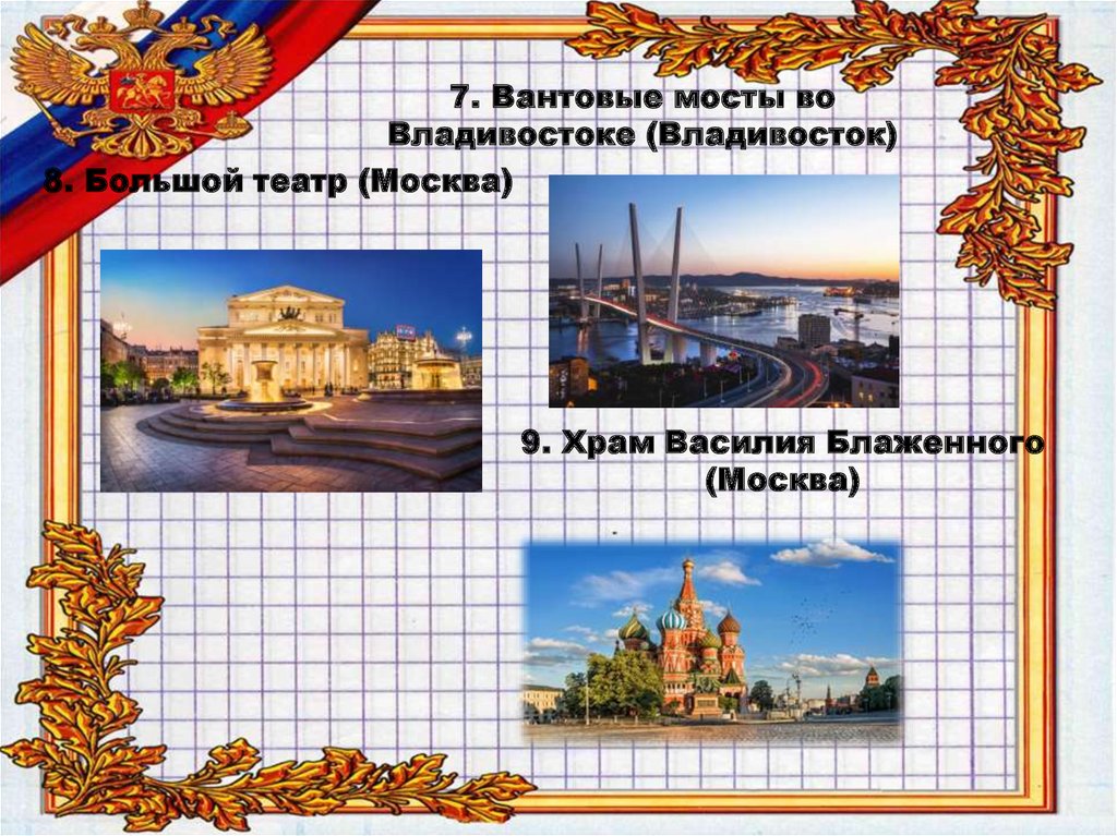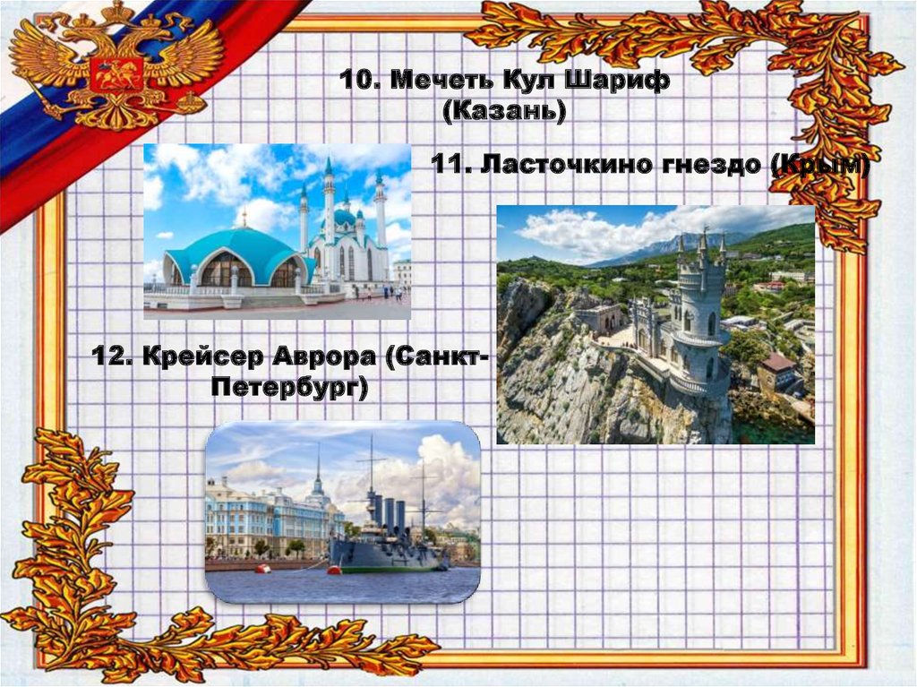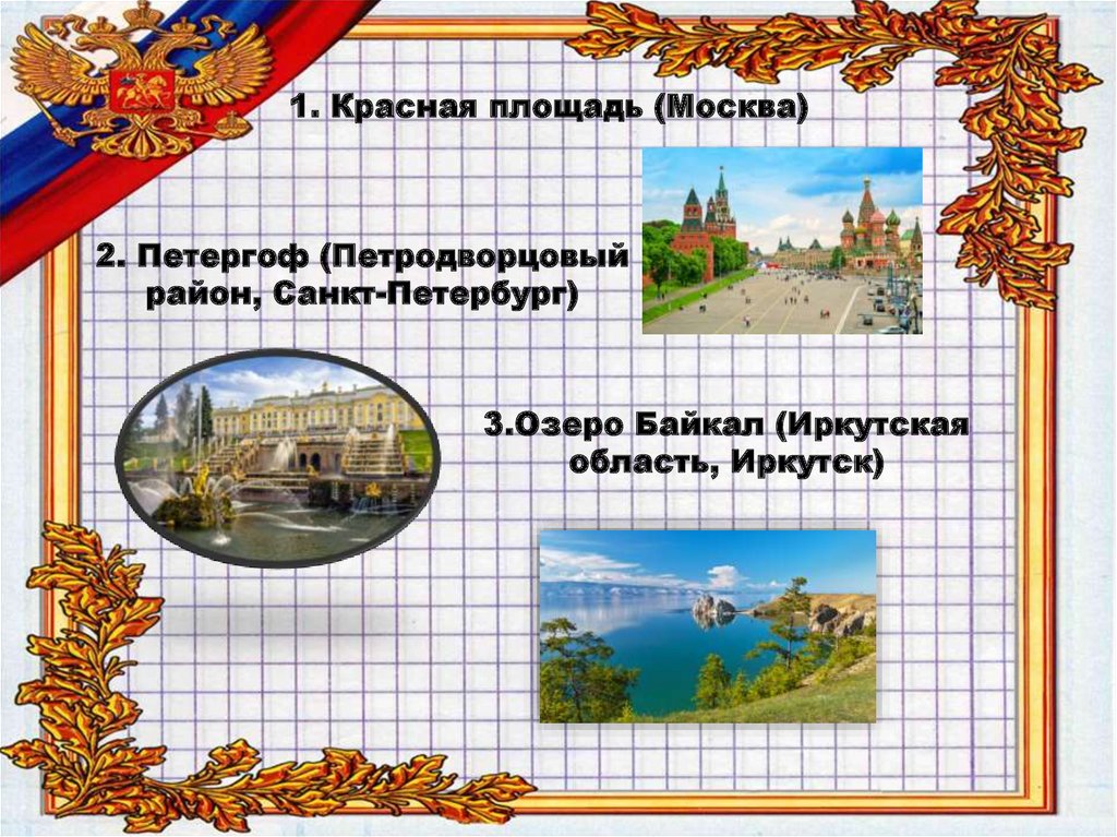 1. Красная площадь (Москва)2. Петергоф (Петродворцовый