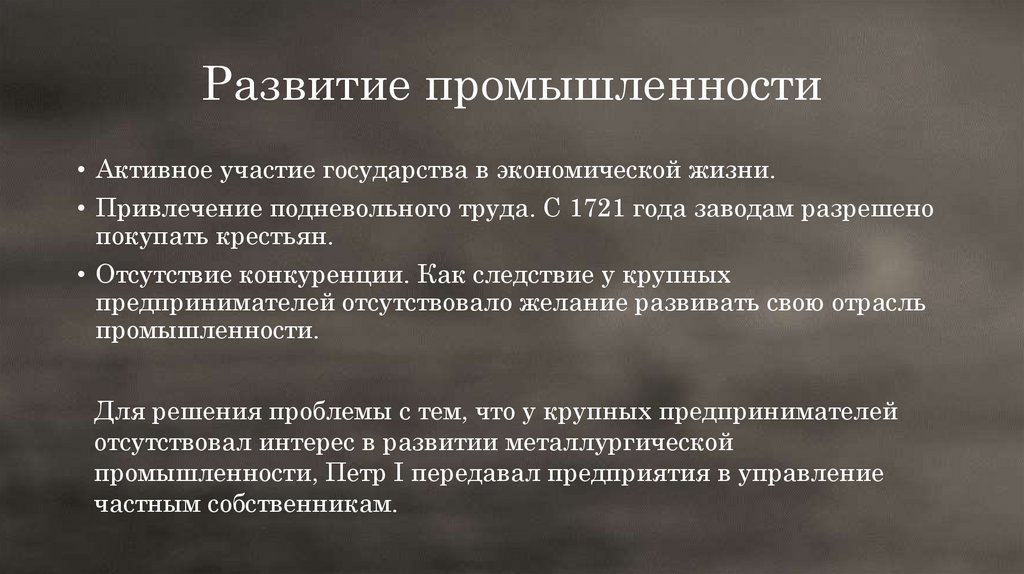 • Привлечение подневольного труда. С 1721 года заводам разрешено