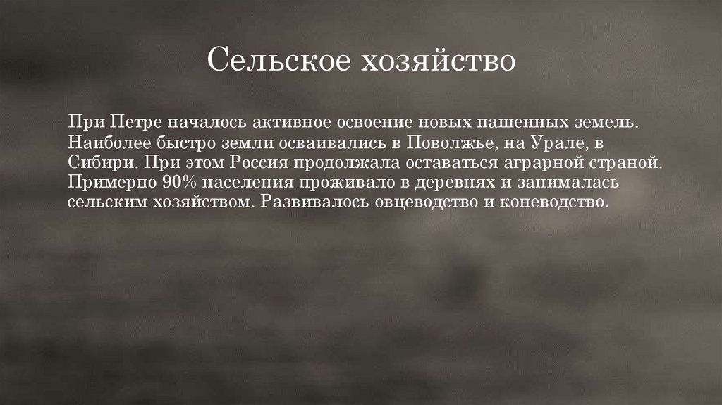 Сельское хозяйствоПри Петре началось активное освоение новых пашенных земель.