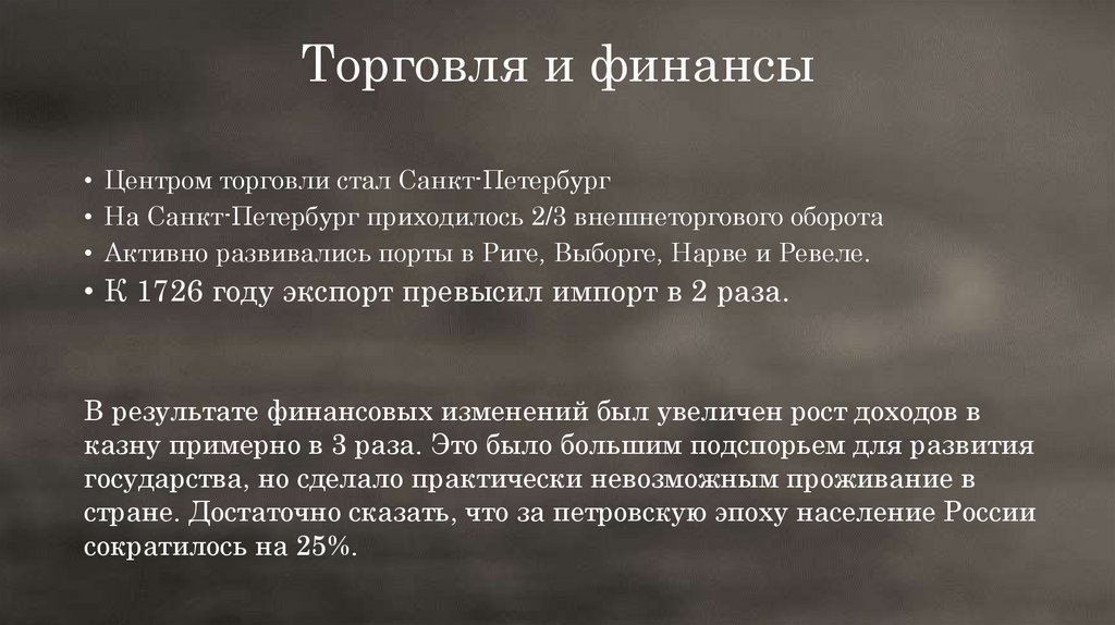 Торговля и финансы• Центром торговли стал Санкт-Петербург
