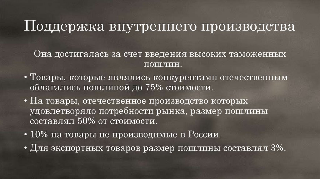 Поддержка внутреннего производстваОна достигалась за счет введения высоких таможенных