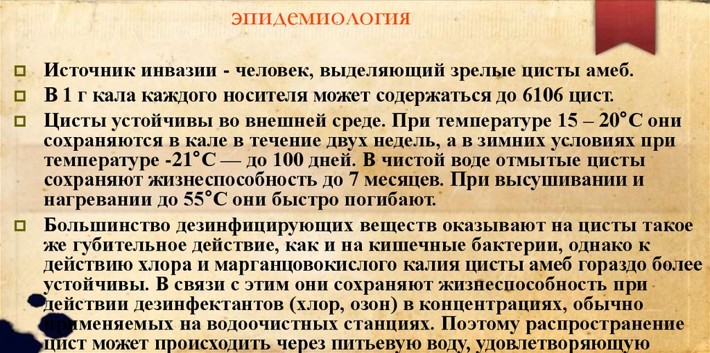 эпидемиологияИсточник инвазии - человек, выделяющий зрелые цисты амеб.
