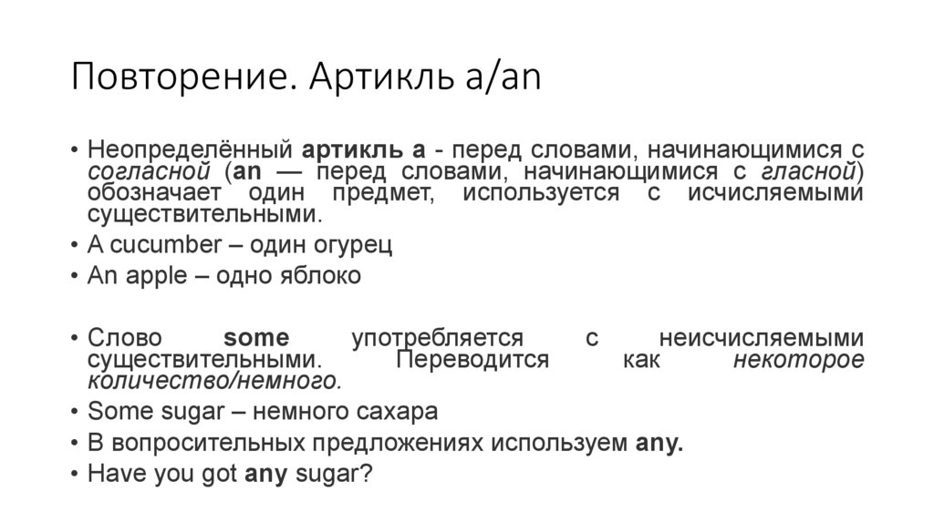 Повторение. Артикль a/an• Неопределённый артикль a - перед словами, начинающимися с