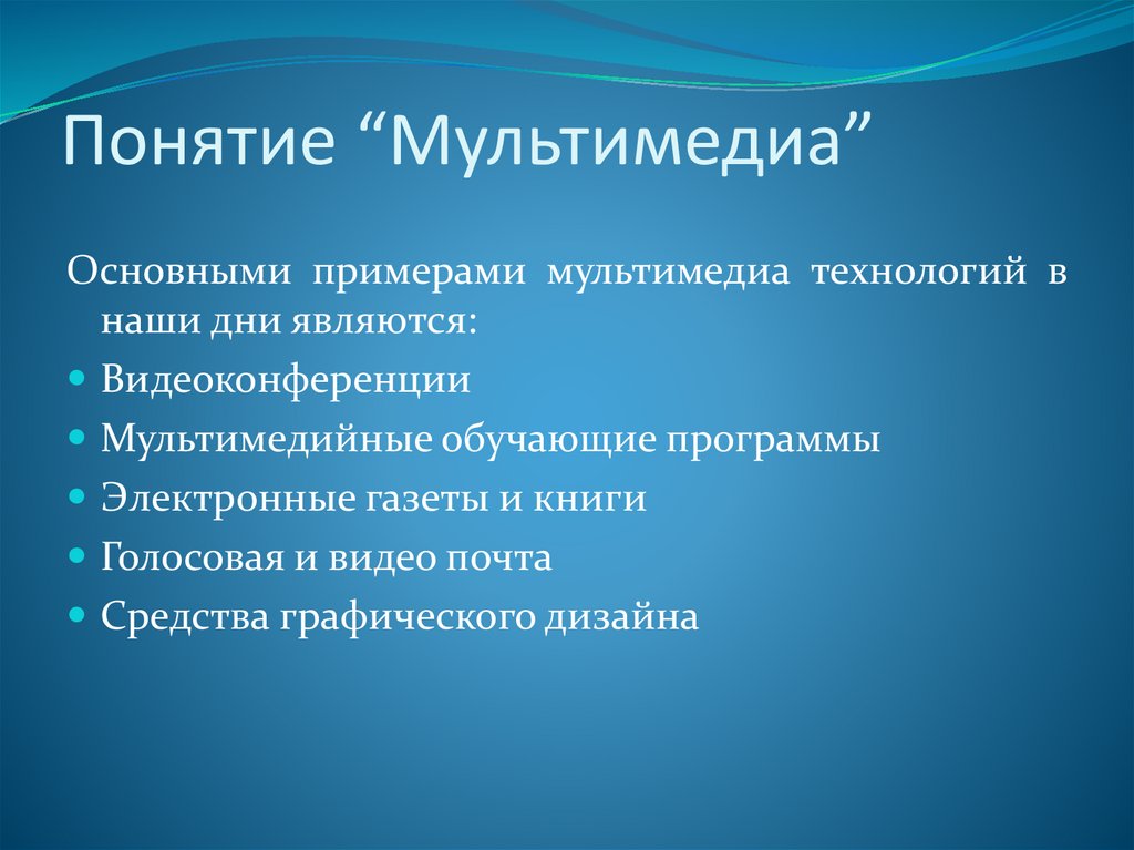 Понятие “Мультимедиа”Основными примерами мультимедиа технологий в