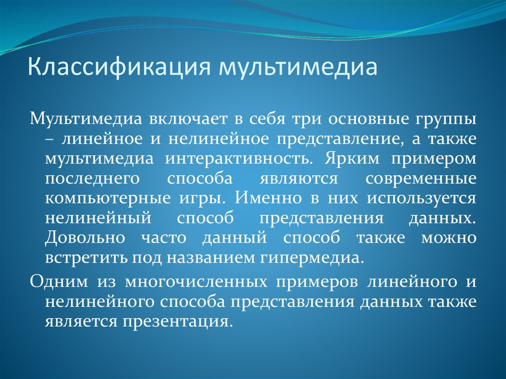 Классификация мультимедиаМультимедиа включает в себя три основные группы