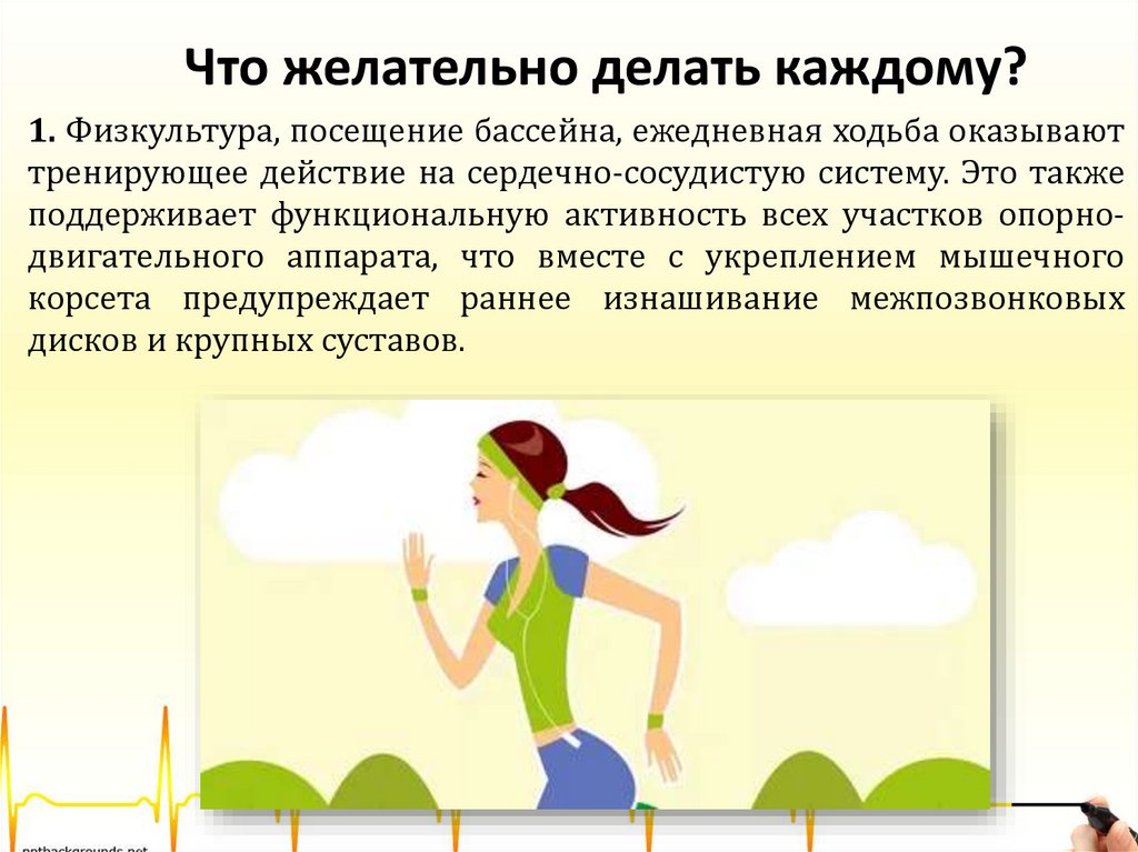 Что желательно делать каждому?1. Физкультура, посещение бассейна, ежедневная ходьба оказывают