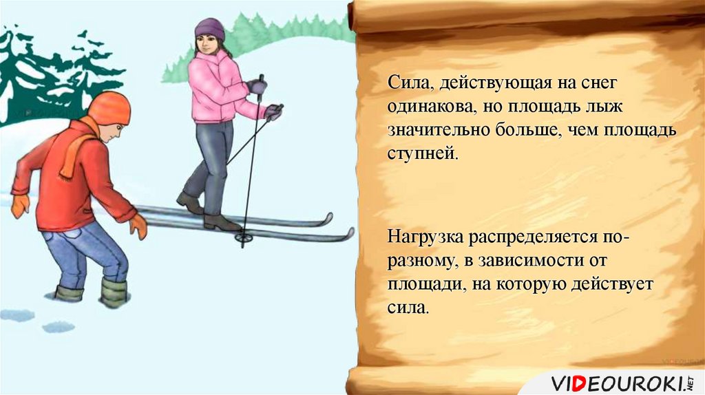 Сила, действующая на снегодинакова, но площадь лыж