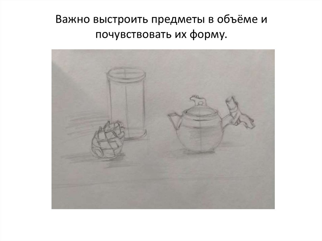 Важно выстроить предметы в объёме ипочувствовать их форму.