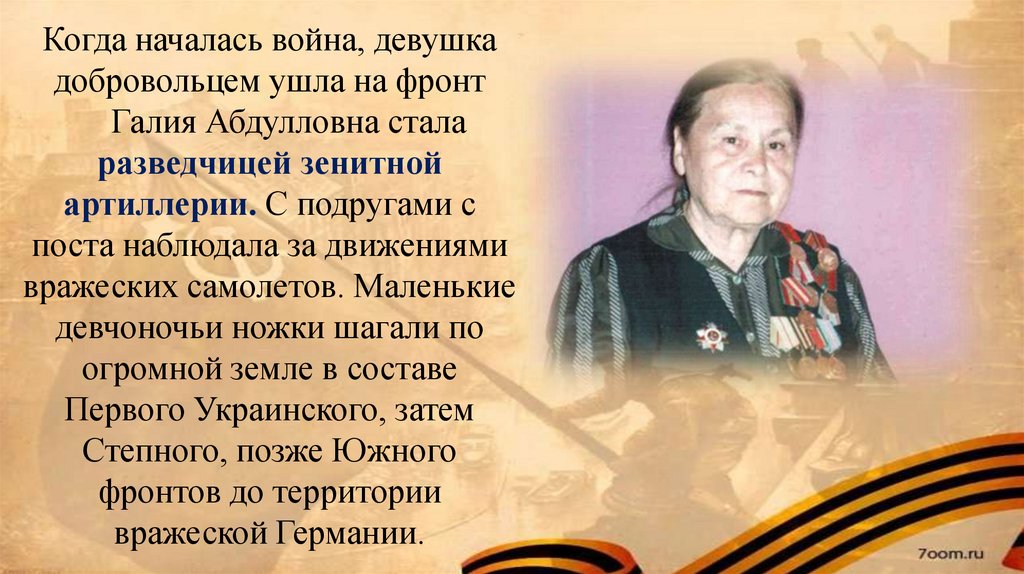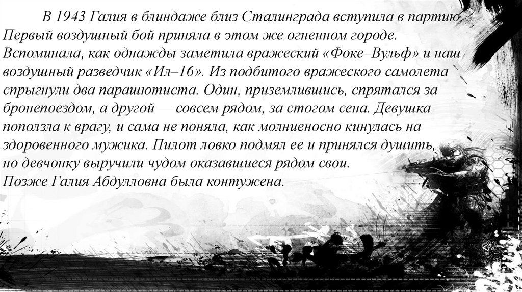 В 1943 Галия в блиндаже близ Сталинграда вступила в партию.Первый воздушный бой приняла в этом же огненном городе.