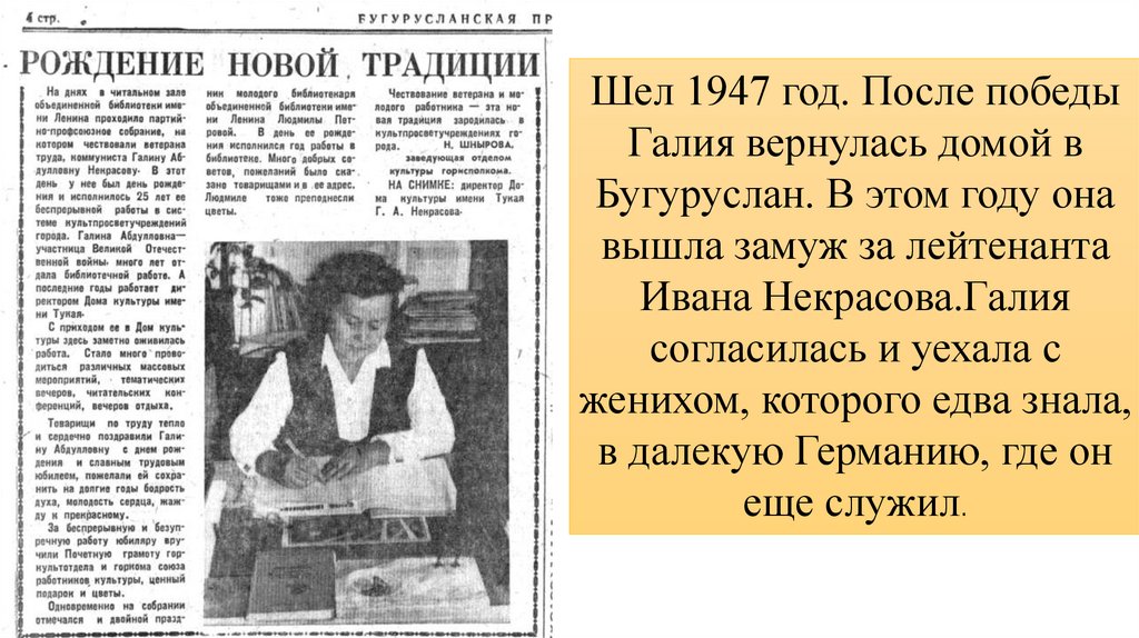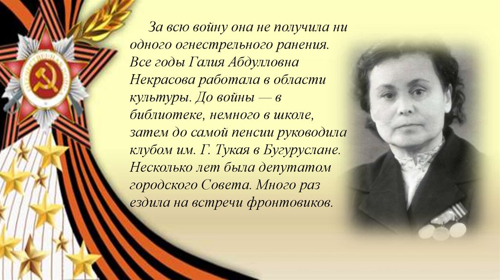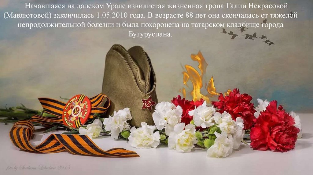 Начавшаяся на далеком Урале извилистая жизненная тропа Галии Некрасовой(Мавлютовой) закончилась 1.05.2010 года. В возрасте 88 лет она скончалась от тяжелой