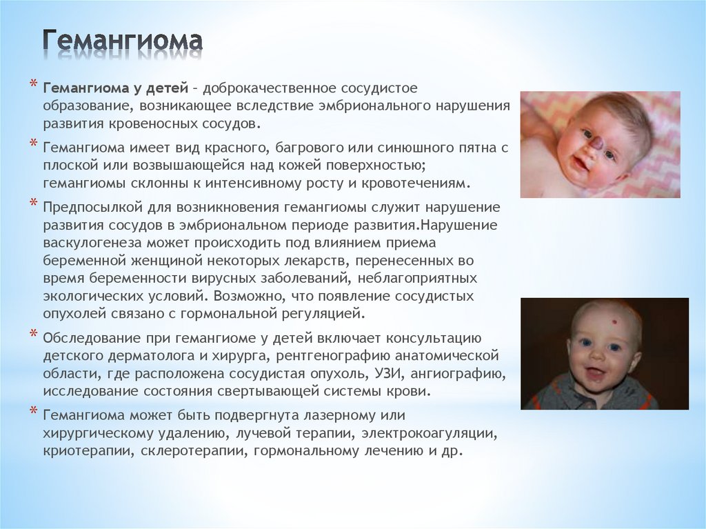 * Гемангиома у детей – доброкачественное сосудистоеобразование, возникающее вследствие эмбрионального нарушения
