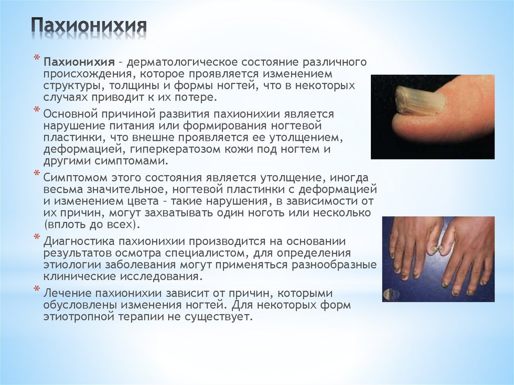 * Пахионихия – дерматологическое состояние различногопроисхождения, которое проявляется изменением