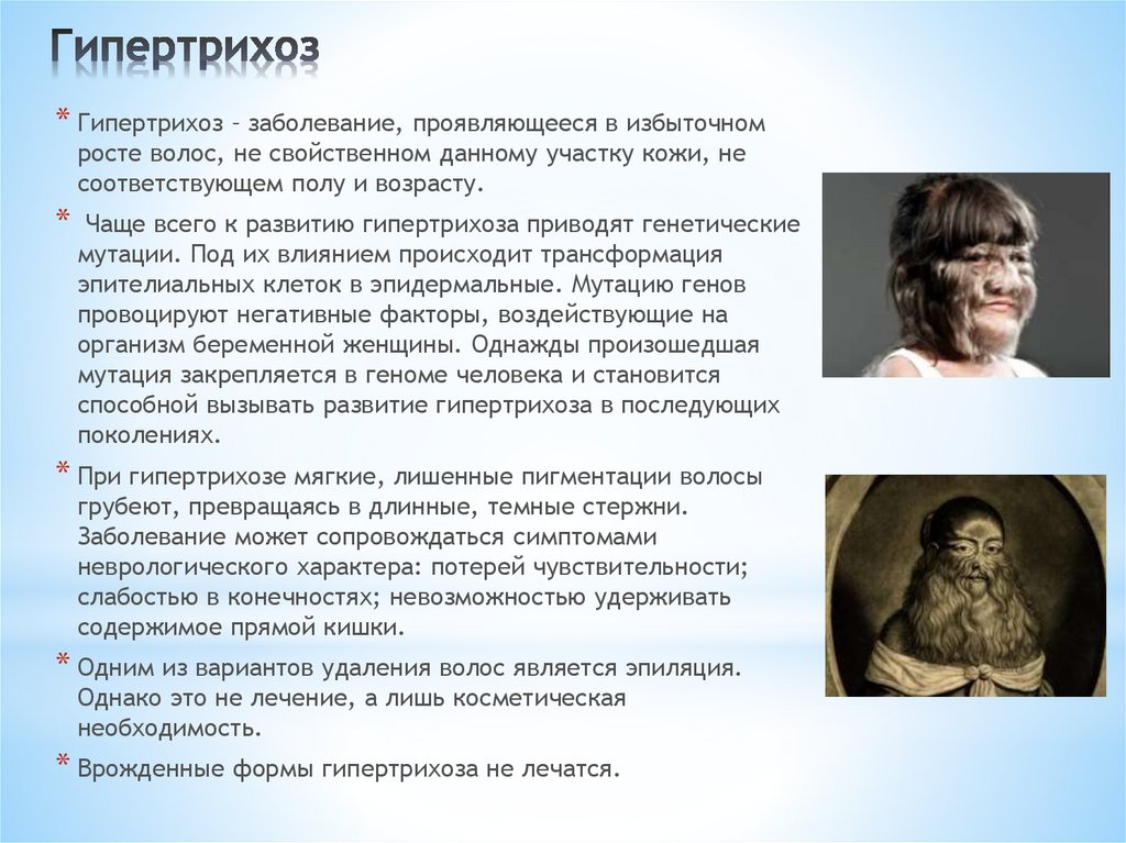 * Гипертрихоз – заболевание, проявляющееся в избыточномросте волос, не свойственном данному участку кожи, не