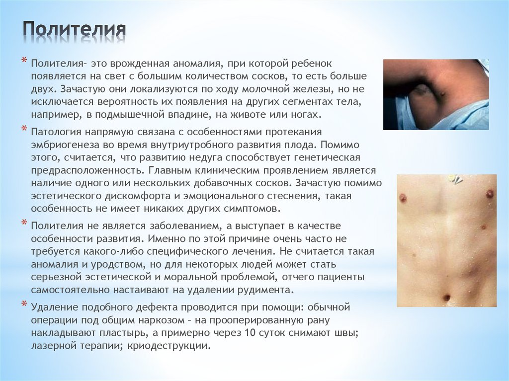 * Полителия– это врожденная аномалия, при которой ребенокпоявляется на свет с большим количеством сосков, то есть больше