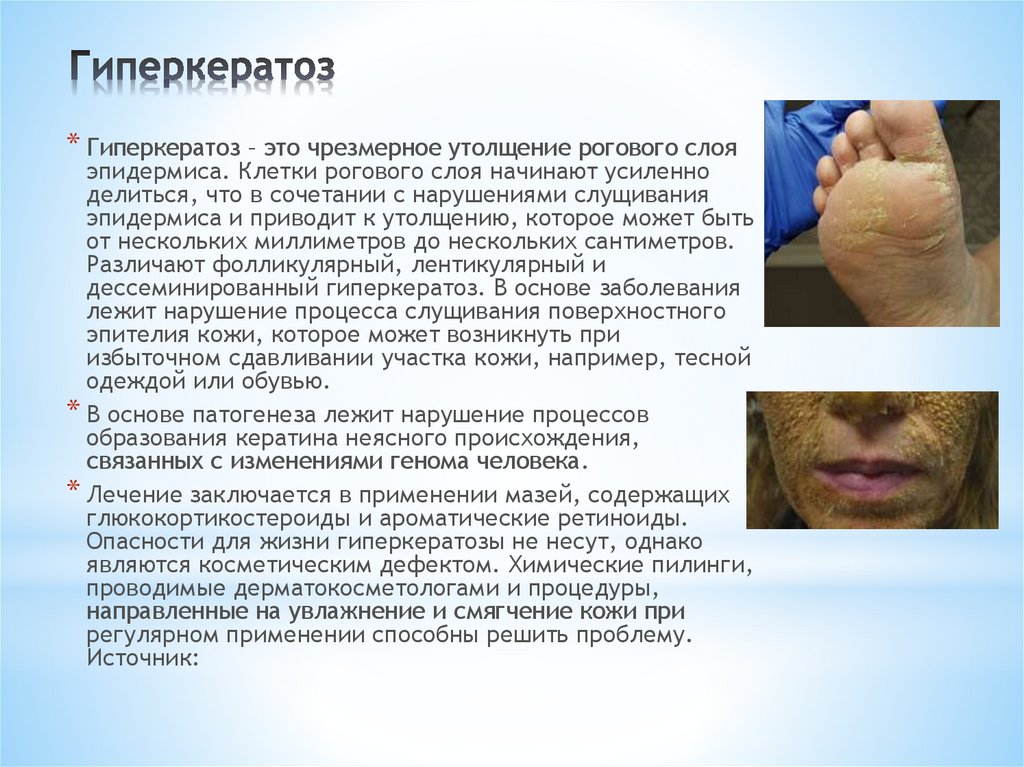 * Гиперкератоз – это чрезмерное утолщение рогового слояэпидермиса. Клетки рогового слоя начинают усиленно
