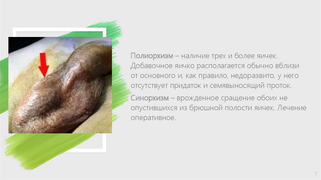 Полиорхизм – наличие трех и более яичек.Добавочное яичко располагается обычно вблизи