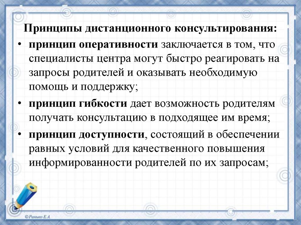 Принципы дистанционного консультирования:• принцип оперативности заключается в том, что
