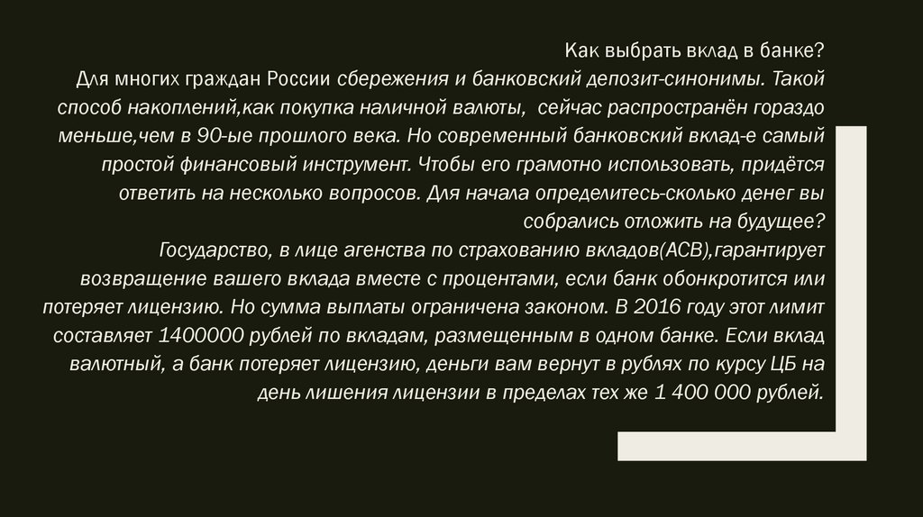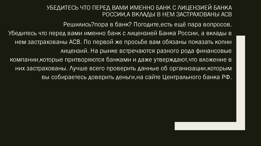 Убедитесь что перед вами именно банк с лицензией Банка России, а вклады в