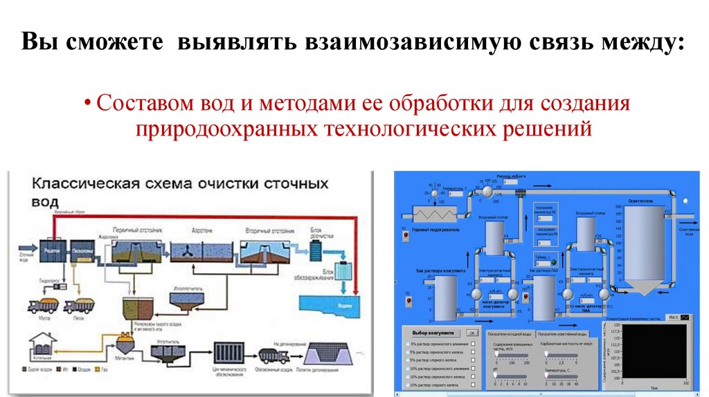 Вы сможете выявлять взаимозависимую связь между:• Составом вод и методами ее обработки для создания