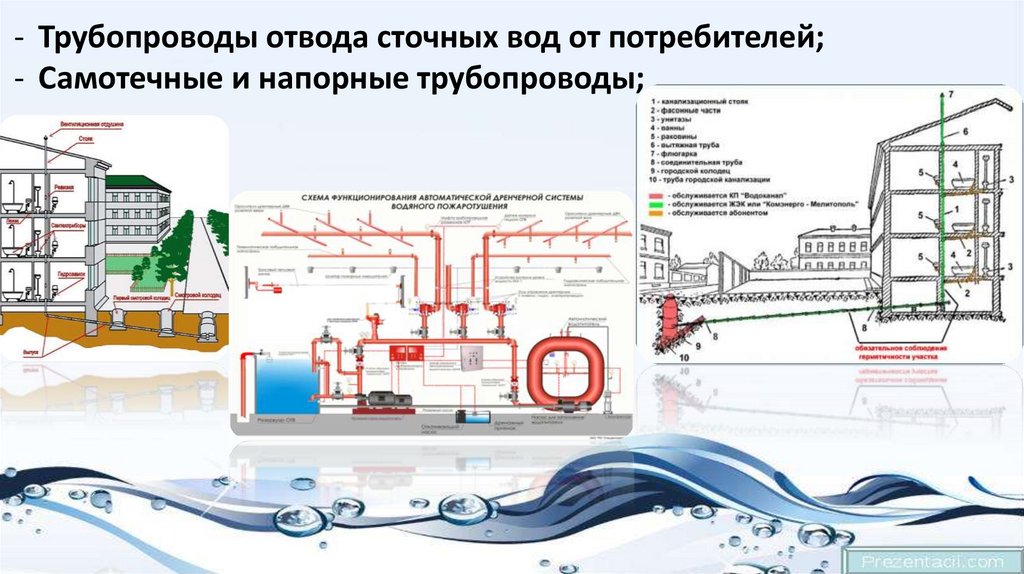 - Трубопроводы отвода сточных вод от потребителей;- Самотечные и напорные трубопроводы;