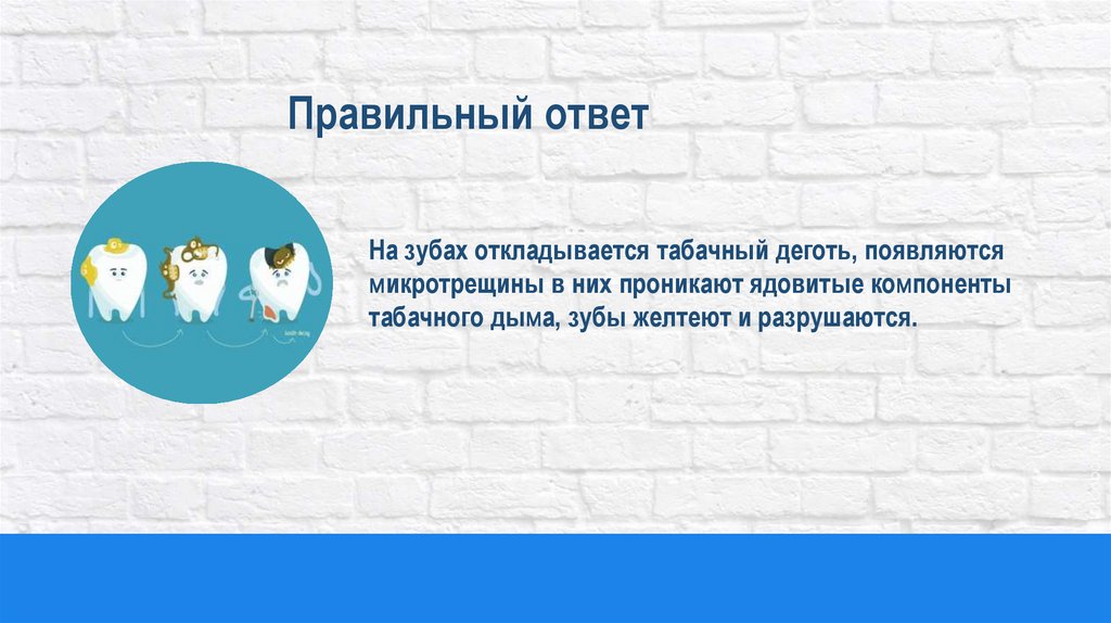 Правильный ответНа зубах откладывается табачный деготь, появляются
