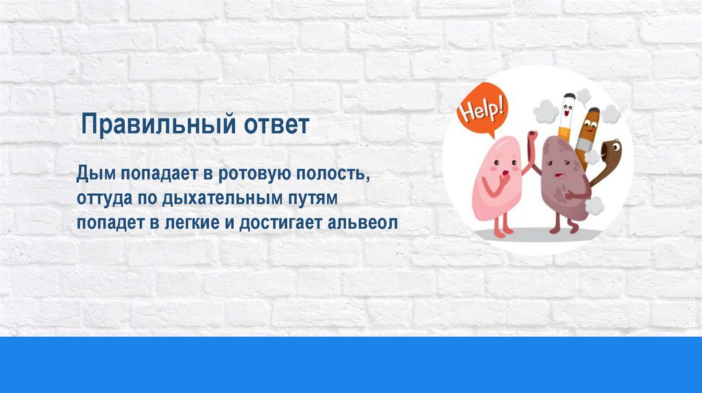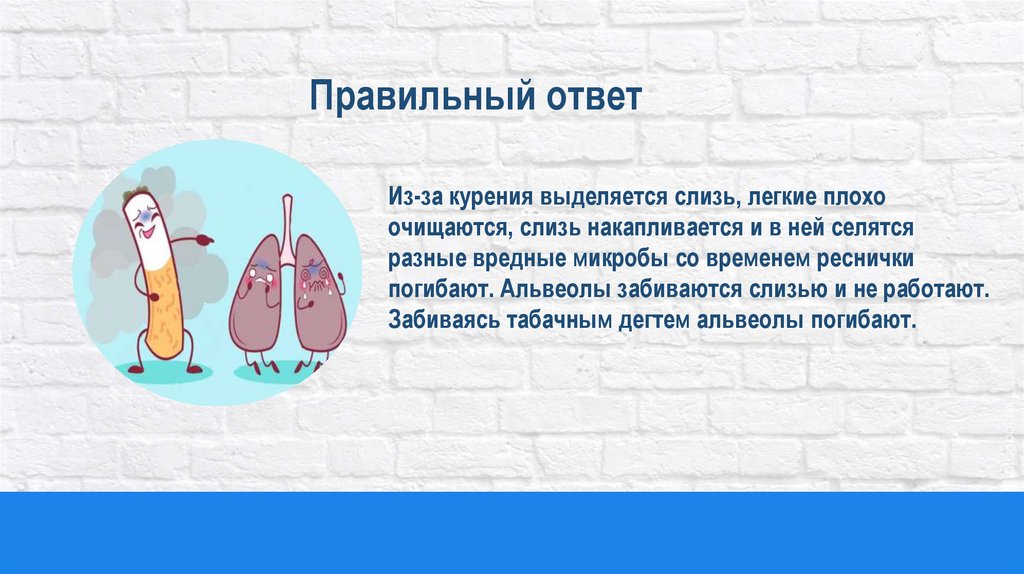 Правильный ответИз-за курения выделяется слизь, легкие плохо