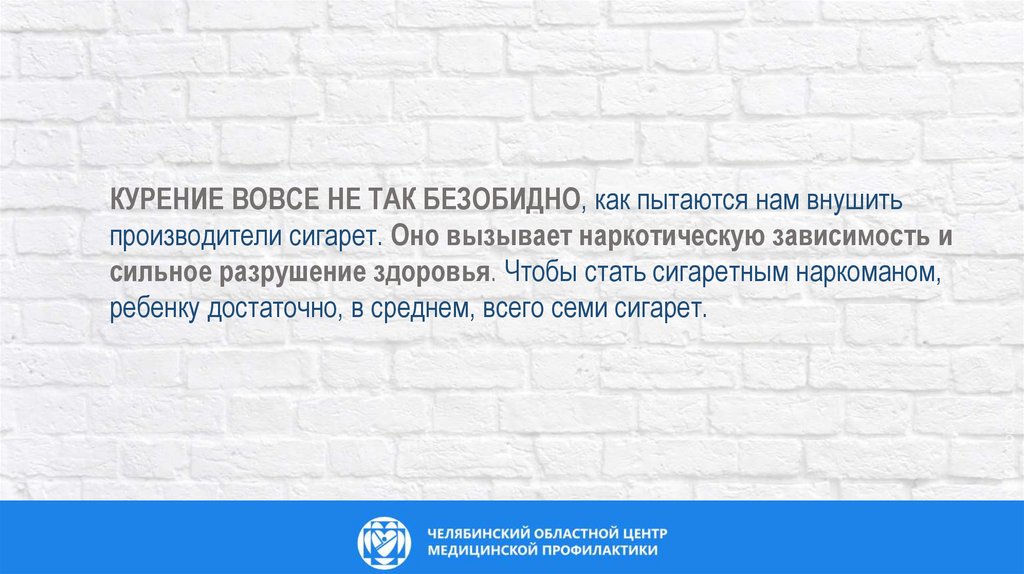 КУРЕНИЕ ВОВСЕ НЕ ТАК БЕЗОБИДНО, как пытаются нам внушитьпроизводители сигарет. Оно вызывает наркотическую зависимость и