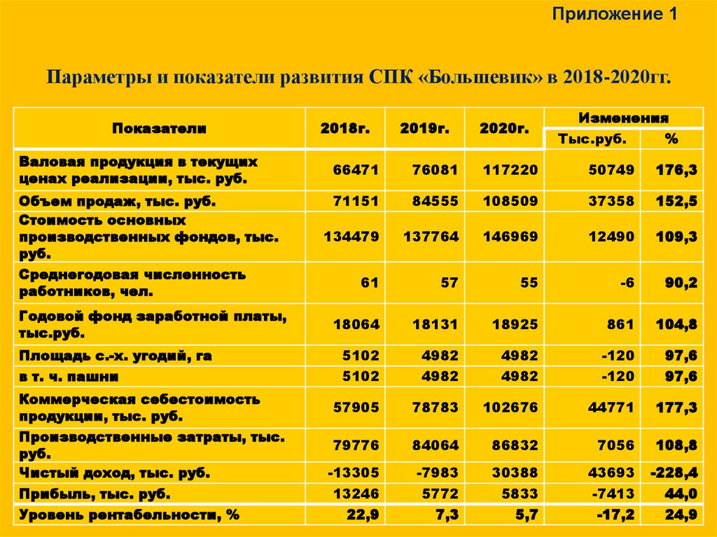 Приложение 1Параметры и показатели развития СПК «Большевик» в 2018-2020гг.