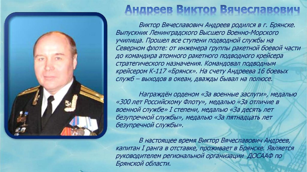 Виктор Вячеславович Андреев родился в г. Брянске.Выпускник Ленинградского Высшего Военно-Морского