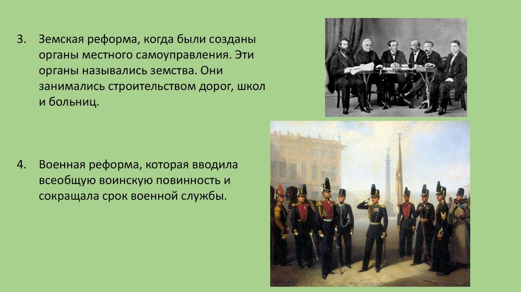 3. Земская реформа, когда были созданыорганы местного самоуправления. Эти
