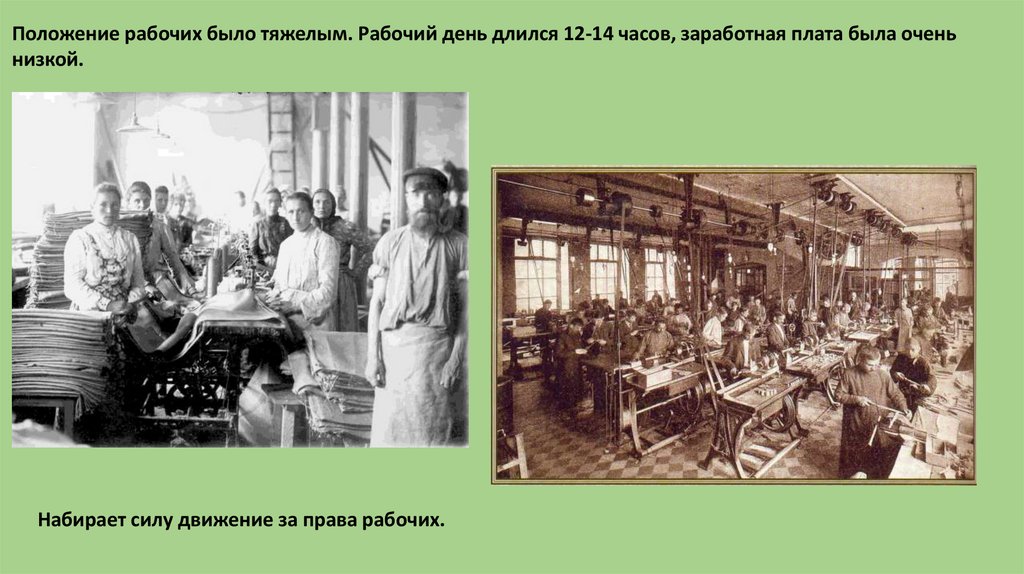 Положение рабочих было тяжелым. Рабочий день длился 12-14 часов, заработная плата была оченьнизкой.