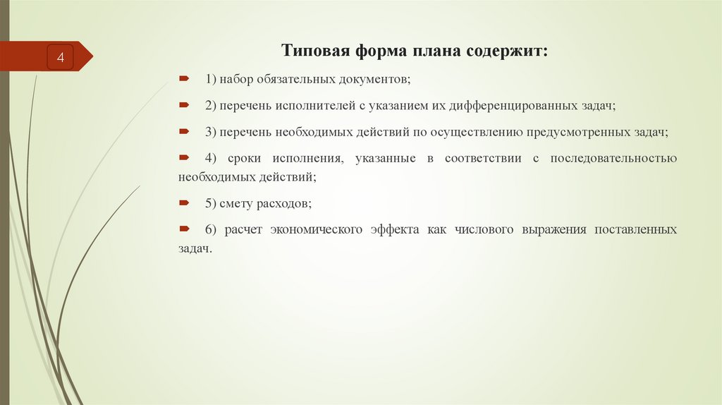 3) перечень необходимых действий по осуществлению предусмотренных задач;
