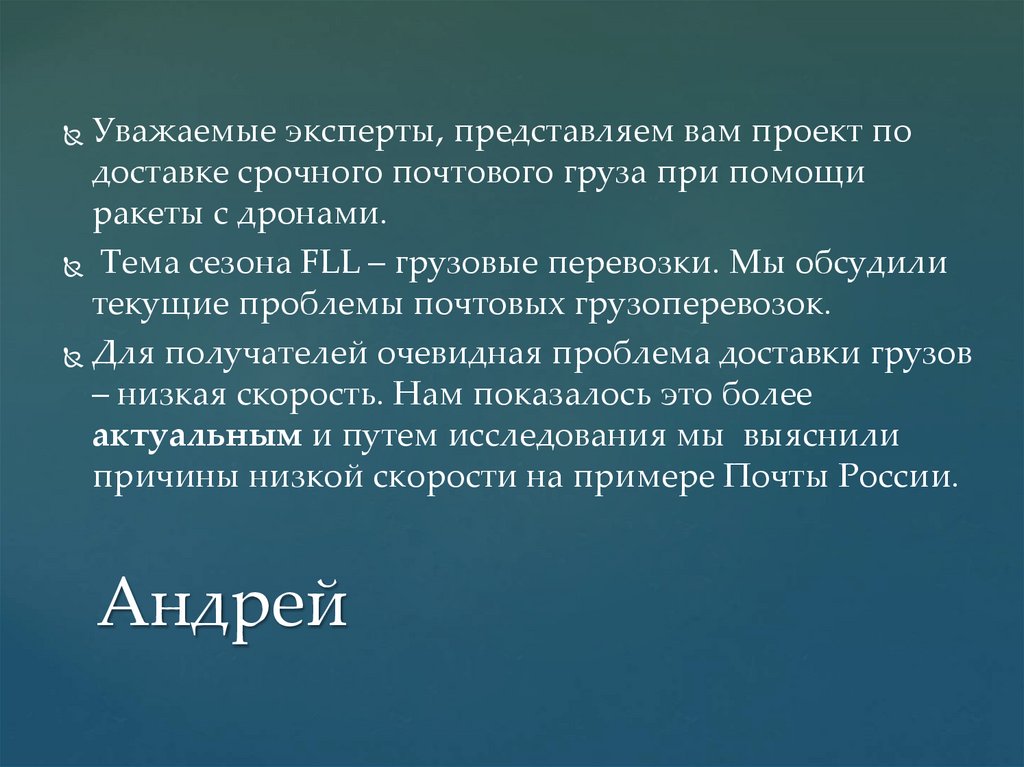 Уважаемые эксперты, представляем вам проект подоставке срочного почтового груза при помощи
