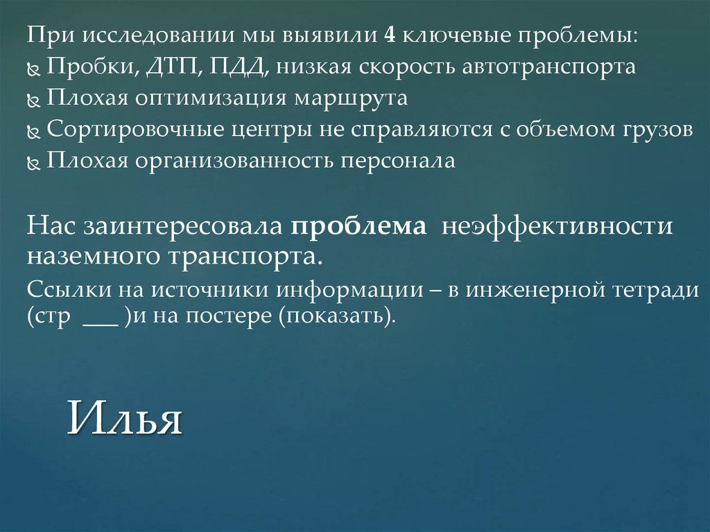 При исследовании мы выявили 4 ключевые проблемы:Пробки, ДТП, ПДД, низкая скорость автотранспорта