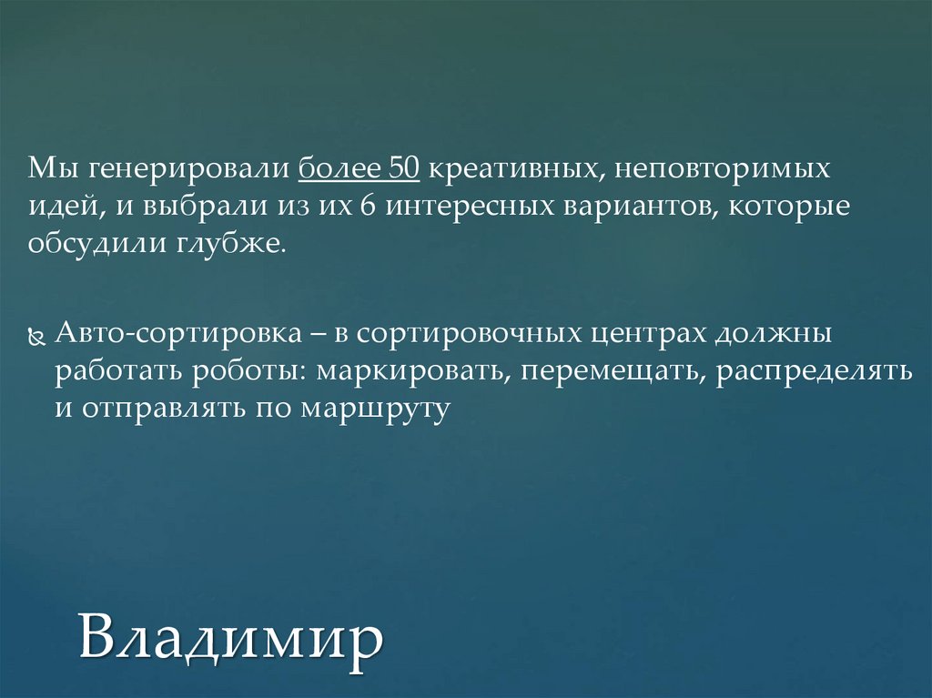 Мы генерировали более 50 креативных, неповторимыхидей, и выбрали из их 6 интересных вариантов, которые