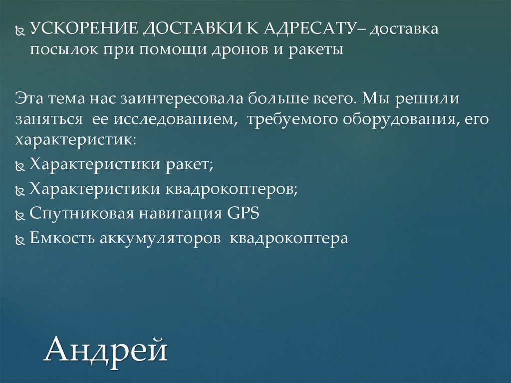 УСКОРЕНИЕ ДОСТАВКИ К АДРЕСАТУ– доставкапосылок при помощи дронов и ракеты