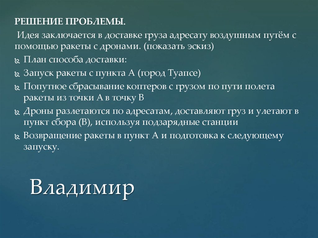 РЕШЕНИЕ ПРОБЛЕМЫ.Идея заключается в доставке груза адресату воздушным путём с