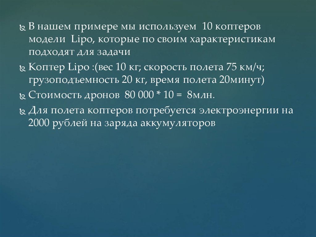Стоимость дронов 80 000 * 10 = 8млн.