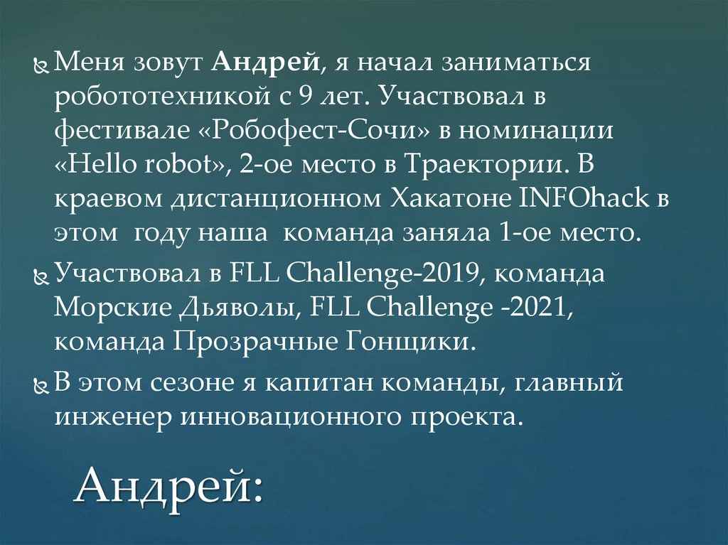 Меня зовут Андрей, я начал заниматьсяробототехникой с 9 лет. Участвовал в