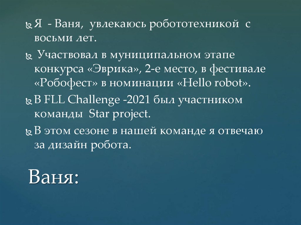 Я - Ваня, увлекаюсь робототехникой свосьми лет.