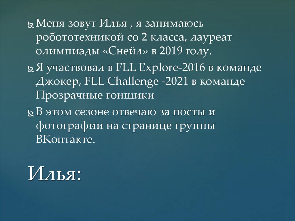 Меня зовут Илья , я занимаюсьробототехникой со 2 класса, лауреат