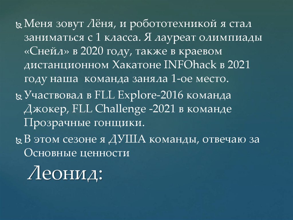 Меня зовут Лёня, и робототехникой я сталзаниматься с 1 класса. Я лауреат олимпиады