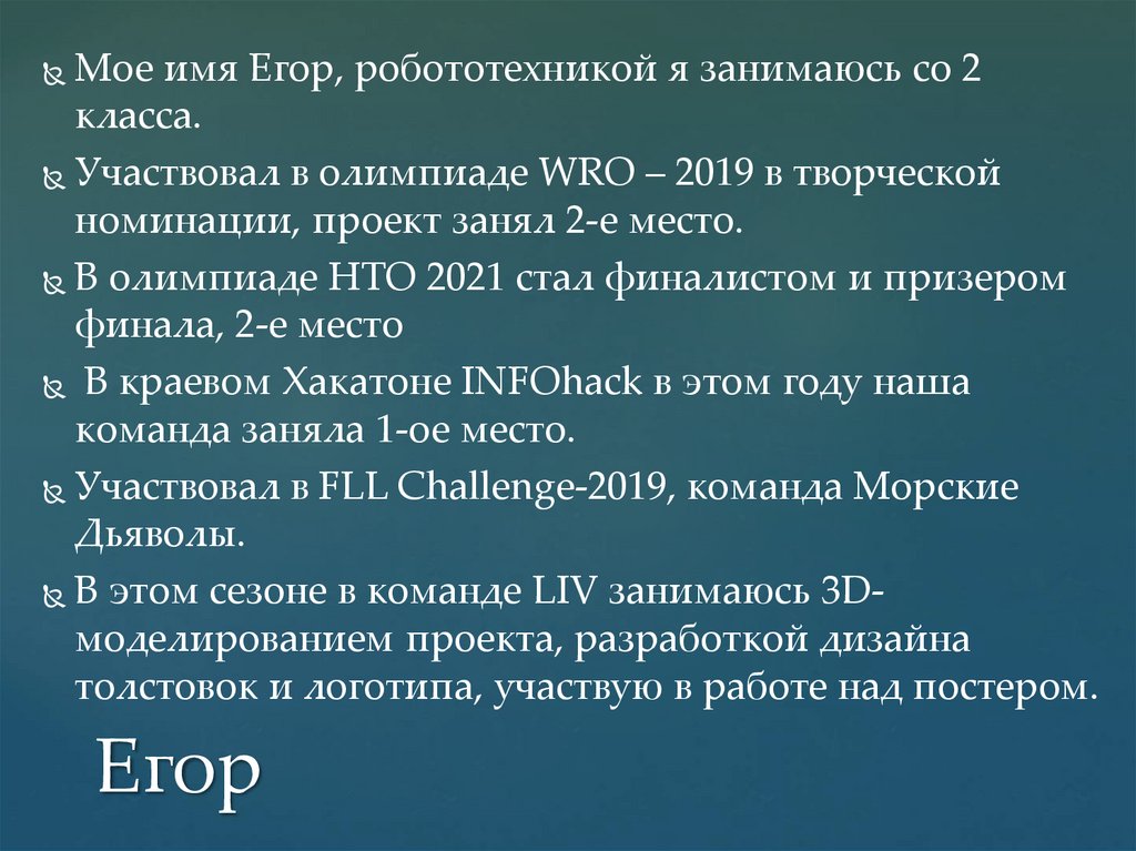 Мое имя Егор, робототехникой я занимаюсь со 2класса.