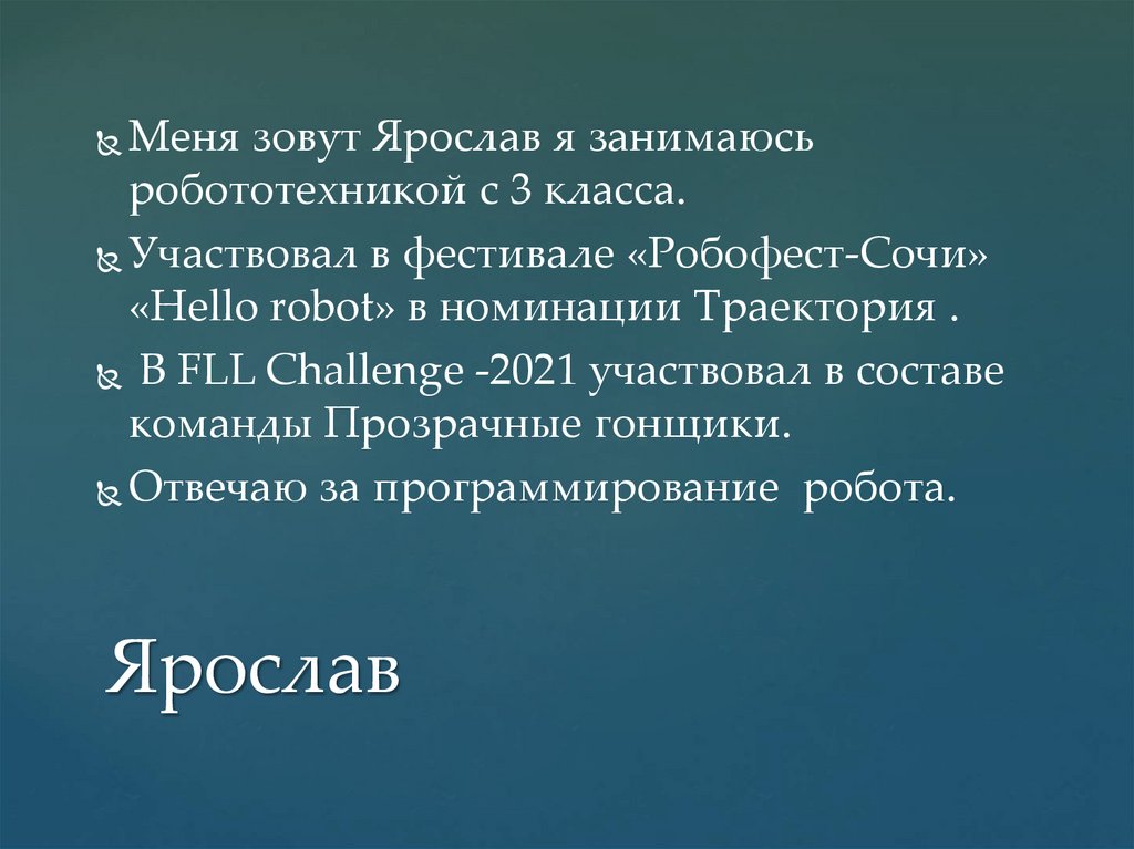 Меня зовут Ярослав я занимаюсьробототехникой с 3 класса.