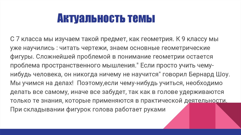 Актуальность темыС 7 класса мы изучаем такой предмет, как геометрия. К 9 классу мы