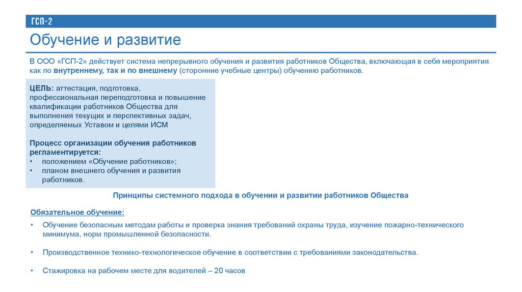 Обучение и развитиеВ ООО «ГСП-2» действует система непрерывного обучения и развития работников Общества, включающая в себя мероприятия